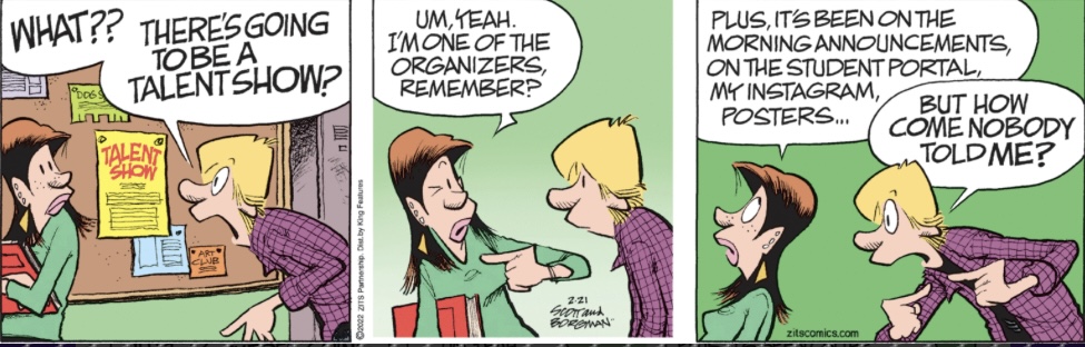 - It was rescheduled. They’re teenagers and my fifteen years as their high school librarian has taught me one thing that is best summed up with the Zits comic from a few weeks back–