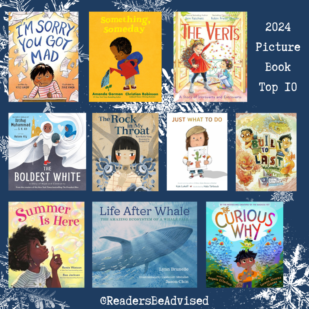 It’s that time of year! Where readers, social media influencers, publishers, libraries, and anyone related to books share their best books. I’m no different. Though my years-end lists always feature books published in that year, not what was read in that year. This year I’ve settled on four categories: picture books, middle grade, young adult, and adult. I decided not to organize by format or genre but instead on audience. Here are my favorite picture books from 2024. Favorites because of their message, their art, and the way the art and words meld.