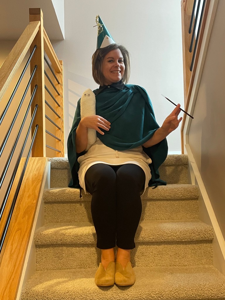 Since I cosplayed Ms. Marvel last year, I figured I would need to up my game this year. I took a poll a few weeks back on whether I should play Alana from Saga or Coco from Witch Hat Atelier, so IYKYK, here I am as Coco in my “work in progress” cosplay (complete with a sylph my son drew on the bottom of my Peter Pan shoes so that if I had my witchy way, I could levitate.