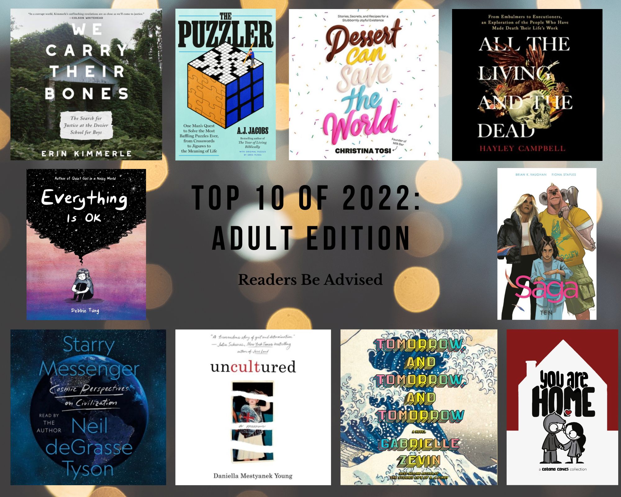 In a few sentences, I will sum up my top 10 adult books– a mix of fiction and nonfiction in all of the formats that I love from audiobooks to graphic novels. They are books that are escape or slice-of-life, they are true stories that will make you cringe and others that will help to celebrate the good in life. Either way, I can’t help but look over the covers and remember a time, a place, a favorite part that I will take with me from 2022.