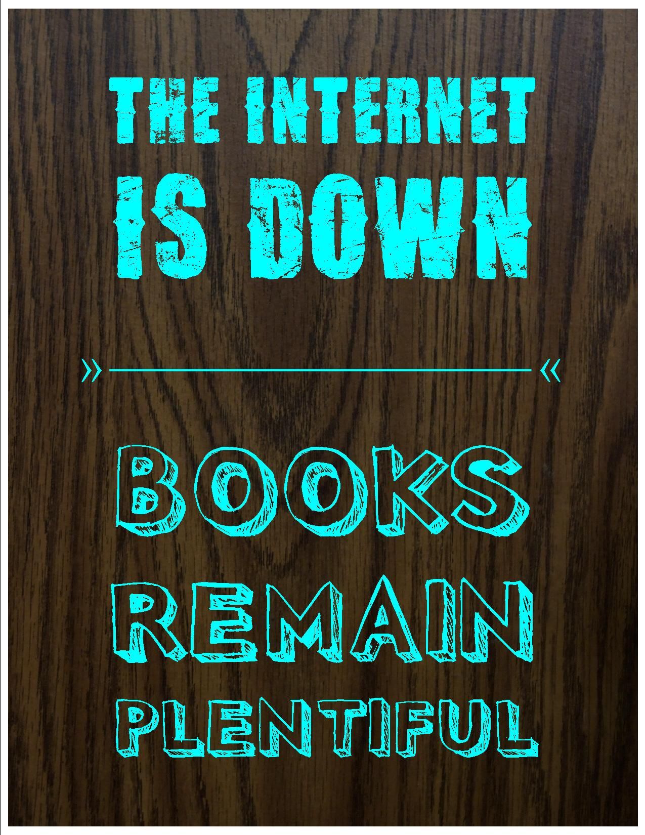 Over the weekend, our large school district experienced a “cyber event” which prompted them to kill the internet for at least three days. Most of us didn’t know until we arrived Monday morning that everything would have to be done without any kind of technology. So after momentary panic, plan B was put in place including the image I’ve been waiting to share on our library’s social media for a while now: